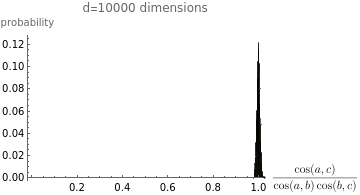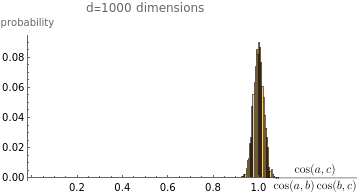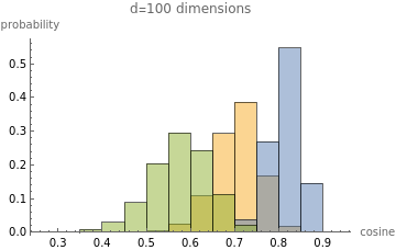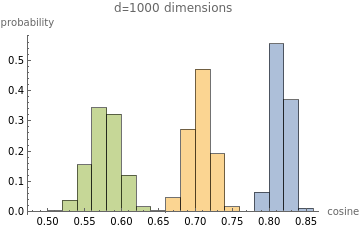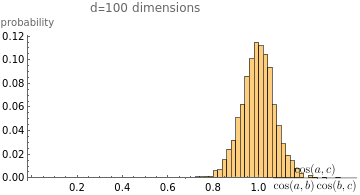 ;batchCos[batch1_,batch2_]:=MapThread[cos[#1,#2]&,{batch1,batch2}];A=randomBatch;B=A+randomBatch;CC=B+randomBatch;Histogram[{batchCos[A,B],batchCos[B,CC],batchCos[A,CC]},Automatic,"Probability",PlotLabel->StringForm["d=`` dimensions",d],AxesLabel->{"cosine","probability"},ChartLegends->{MaTeX["\\cos(a,b)"],MaTeX["\\cos(b,c)"],MaTeX["\\cos(a,c)"]}];makePlot2[100]Out[]=
