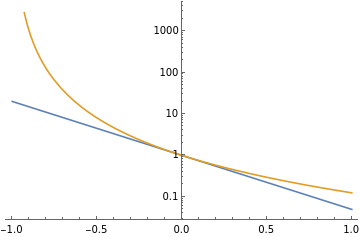 With[{t=-3},LogPlot[{Exp[tx],(1+x)^t},{x,-1,1},PlotLegends->{"exp","power"}]]