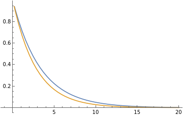 With[{x=.3},Plot[{Exp[-tx],(1-x)^t},{t,-1,20},PlotLegends->{"","(1-x"}]]