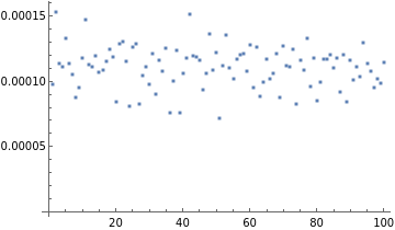 eval:=(d=100;X=RandomReal[{-1,1},{d,d}];H=X.X;H=H/Norm[H];A=-H;t=10;ii=IdentityMatrix[d];traceNormalize[vec_]:=vec/Total[vec];u=traceNormalize@RandomReal[{0,1},{d}];v=traceNormalize@RandomReal[{0,1},{d}];Clear[f];u=traceNormalize@ConstantArray[1.,{d}];v=u;f[mat_]:=u.mat.v;f@MatrixExp[tA]-f@MatrixPower[ii+A,t]);ListPlot@Table[eval,{100}]