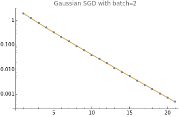 debugSampler[B_]:=Module[{},{{Sqrt[2],0},{0,2}}];(*batchweightedharmonicmeanbetweenminandmax.Suchthatb=1givesminandb=∞givesmax.Halfwaypointisat+1*)hmean[min_,max_,b_]:=+;cov[X_]:=X.X/Length[X];Clear[step,batchStep];h={1,2};d=Length[h];(*dimensions*)b=2;(*batchsize*)sampler=gaussianSampler[h];r=;(*effectiverankr*)rs=Witha=,b=1,+2;(*stochasticrankr,0.5ofharmonicmeanofr/2and1*)α=hmean[rs,r,b];α/=2;outer2[x_]:=Outer[Times,x,x];CircleTimes=KroneckerProduct;H=DiagonalMatrix[h];hh=outer2[h];II=IdentityMatrix[d];T=II-2αH+(2H.H+h⊗h)+H.H;SeedRandom[1];bound=1.2;numSteps=20;numSamples=2000;eb0=A.A.w;batchStep[wb_]:=step/@wb;ebHist=NestList[batchStep,eb0,numSteps];covHist=NestList[T.#&,ConstantArray[1.,d],numSteps];ListLogPlot[{Tr[cov@#]&/@ebHist,Tr/@covHist},PlotLegends->{"observed","predicted"},PlotStyle->{Small,Large},Joined->{False,True},PlotLabel->StringForm["Gaussian SGD with batch=``",b]]