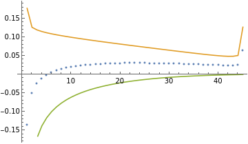 numSamples=45;eigs=Table[eigMagnitude,{x,0,1,1./numSamples}];dpr1=Rest@Eigenvalues[-2DiagonalMatrix[eigs]+{eigs}.{eigs}];ListPlot[{dpr1,-2Most[eigs],-2Rest[eigs],-Total/@Partition[eigs,2,1]},Filling->{2->{3}},Joined->{True,True,True,False},PlotLegends->{"True","Upper","Lower","Average"}]