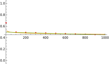 ;f2=exponentialFit[xvals[[maxSteps/2;;maxSteps-maxSteps/4]],yvals[[maxSteps/2;;maxSteps-maxSteps/4]]];fittedPlot=Plot[{None,f1[t],f2[t]},{t,0,maxSteps},PlotLegends->{None,f1[t],f2[t]}];Show[observedPlot,fittedPlot,PlotRange->{{0,maxSteps},{0,1}}]Out[]=
