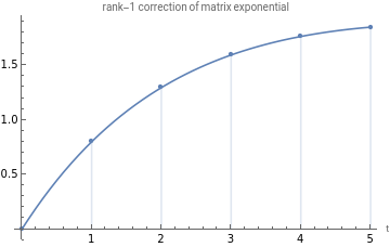 (*" B=",MatrixForm[nf@B]," u=",u];*)init[1];vy=;gSto1y[y_]=;Print["a=",MatrixForm@Diagonal[A]];Print["u=",MatrixForm@u];Print["v(y)=",MatrixForm@vy];Print["f(y)=",gSto1y[y]//FullSimplify];Print["[f](t)=",InverseLaplaceTransform[N@gSto1y[y],y,t]];Print["A=diag(a)=",MatrixForm[A]];Print["B=uu",MatrixForm[B]];trajSto1=InverseLaplaceTransform[gSto1y[y],y,t];plot1=Plot[sum[exp[t(A+B)]-exp[tA]],{t,0,5},PlotLegends->{"<>-<>"},AxesLabel->{"t"}];plot2=DiscretePlot[trajSto1,{t,0,5},PlotLegends->"[f](t)",AxesLabel->{"t"}];Show[plot1,plot2,PlotLabel->"rank-1 correction of matrix exponential"]
