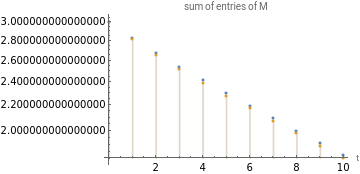 Print[SF["T=``+``",MatrixForm[A],MatrixForm@Hr]];DiscretePlot@@{sum/@{exp[tAsgd],pow[ii+Asgd,t]},{t,0,10},ScalingFunctions->"Log",PlotLegends->{"M=exp(t T)","M=(I+T"},PlotLabel->"sum of entries of M",AxesLabel->{"t"}}