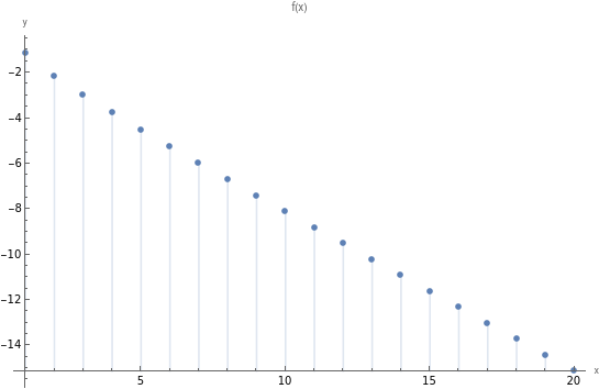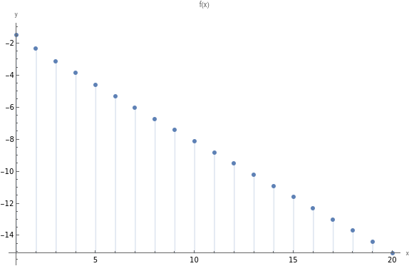 breakeven[r0_]:=y/.With{r=SetPrecision[r0,10]},FindRoot2Gamma,Exp[y]-x-12,{y,};empiricalPlot=DiscretePlot[breakeven[r],{x,1,20,1},PlotRange->All,AxesLabel->{"x","y"},PlotLabel->"f(x)"]