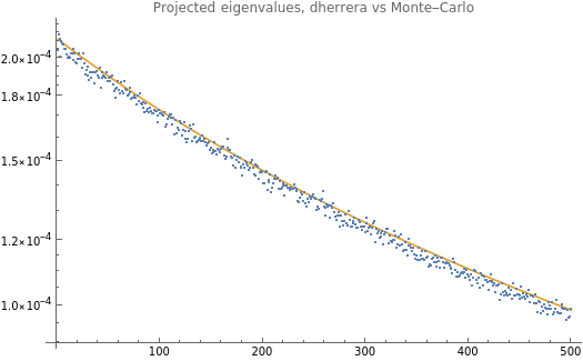 (*Gaussiansampler*)SeedRandom[1,Method->"MKL"];gaussianSampler[diag_]:=With{d=Length[diag]},Compile{{n,_Integer}},Module{vals,diagSqrt},diagSqrt=,{i,1,d}];h=h/Total[h];hp=getDiag[normalizedGaussianSampler[h],m];);(*sumofsquaresofrelativeerrors*)getError[predicted_,true_]:=With[{r=(predicted-true)/predicted},Total[r*r]];(*computetailerror*)getTail[val_]:=With[{tailLength=Ceiling[Length[val]/2]},val[[-tailLength;;]]];getTailError[predicted_,true_]:=getError[getTail@predicted,getTail@true];getErrors[predicted_,true_]:={getError[predicted,true],getTailError[predicted,true]};d=1000;p=1.1;m=10000;nf[val_]:=NumberForm[N@val,{3,3}];setupPowerlawGaussian[d,p,m];herrera=h(1+2Tr[])-2;herreraAdj=h(1+1.7Tr[])-2;ListLogPlot[{getTail[hp],getTail[h(1+2Tr[])-2]},Joined->{False,True},PlotStyle->PointSize[Small],PlotLabel->"Projected eigenvalues, dherrera vs Monte-Carlo",PlotLegends->{"observed",HoldForm[h(1+2Tr[])-2]}]