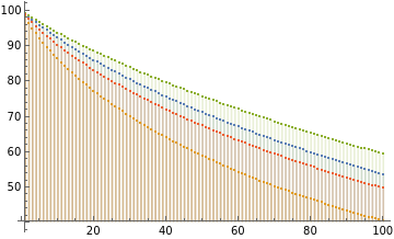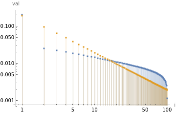 On[Assert];eigs=Eigenvalues[M0];Assert[Tr[M0]==Total[eigs]];JJ=ConstantArray[1.,{d,d}];Assert[Total[M0,2]==Tr[M0.JJ]]UU=Eigenvectors[M0];v=UU.ones;Assert[Total[M0,2]==Dot[v*v,eigs]];(*approximateequalitytesting*)DotEqual[a_,b_]:=Norm[Flatten[{a}]-Flatten[{b}],∞]<1*^-9;Assert[Dot[v*v,]≐Total[MatrixPower[M0,t],2]];(*Traceandsumarebothweightedsumofeigenvalues*)uniform=ConstantArray[1.,d]/d;Tr[MatrixPower[M0,t]]-d*Dot[,uniform];vdist=v2/Total[v2];Assert[sum[MatrixPower[M0,t]]≐d*Dot[,vdist]];nlz[v_]:=v/Total[v];ListLogLogPlot[{nlz@,h},Filling->Axis,PlotRange->All,AxesLabel->{"i","val"},PlotLegends->{"",""}]uniform=ConstantArray[1.,d]/d;Tr[MatrixPower[M0,t]]-d*Dot[,uniform];vdist=v2/Total[v2];Assert[sum[MatrixPower[M0,t]]≐d*Dot[,vdist]]DiscretePlotd*Dot[,vdist],d*Dot[,uniform],d*Dot[,h],d*Dot,nlz@,nlz[","","custom fit"