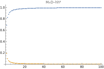 d=100;t=d;h=Table[,{i,1,d}];z=Total[h];h=h/z;II=IdentityMatrix[d];ones=ConstantArray[1.,d];(*D$isdiagonal*)A=DiagonalMatrix[2h(1-h)];B={h}.{h};(*M0isdiagonal+rank1*)M0=II-(A-B);(*Mis*)t=d;Mt=MatrixPower[M0,t];UU=Eigenvectors[M0];v=UU.ones;v2=v*v;eigs=Eigenvalues[M0];sum[x_]:=Total[x,2];DiscretePlot[{sum[MatrixPower[M0,t]],Tr[MatrixPower[M0,t]],Tr[MatrixPower[M0,t]]+*v2[[1]]},{t,1,2d},PlotLegends->{"sum of entries of ","Tr()","+Tr()"},AxesLabel->{"t","value"}]ListPlot[{Diagonal[II-A],h},PlotLegends->{"entries of D","entries of h"},PlotLabel->"M=D-hh"]sum[T_]:=Total[T,2];{N@sum[Mt],"sum of entries of Mt"}{N@Tr[Mt],"trace of Mt"}