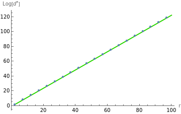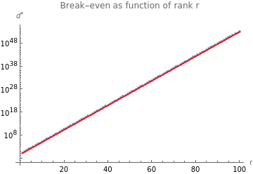 Clear["Globals`*"];predict[p_]:=Exp-0.5843521872961219`+1.228079016227338`*;breakEven[p_]:=d/.FindRoot==*2,{d,Floor[predict[p]]},AccuracyGoal->1rvals=Table[r,{r,1.,100}];dvals=breakEven[1+1/#]&/@rvals;observedPlot=ListPlot[{rvals,dvals},ScalingFunctions->{Automatic,"Log"},AxesLabel->{"r",""},PlotLabel->"Break-even as function of rank r",PlotLegends->{"observed"}];fit=LinearModelFit[{rvals,Log@dvals},x,x]predictedPlot=LogPlot[Exp@fit[r],{r,Min@rvals,Max@rvals},PlotLegends->{fit},PlotStyle->Red];Show[observedPlot,predictedPlot]