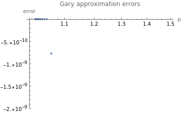 ListPlot[{pvals,dvals1-dvals2},ScalingFunctions->{"Log",Automatic},PlotLabel->"Gary approximation errors",AxesLabel->{"p","error"}]