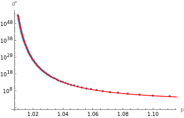 predict2[p_]:=Exp-0.5872825625315911`+1.2281342999064533`;pvals=Table1+,{r,2.,100};dvals=breakEven/@pvals;sf={Automatic,"Log"};observedPlot=ListPlot[{pvals,dvals},ScalingFunctions->sf,PlotStyle->PointSize[Medium]];predictedPlot=Plot[predict2[p],{p,Min[pvals],Max[pvals]},PlotRange->All,ScalingFunctions->sf,PlotLegends->{MaTeX["c_1 \\exp \\left(\\frac{c_2}{p-1}\\right)"]},PlotStyle->Red];Show[observedPlot,predictedPlot,AxesLabel->{"p",""}]