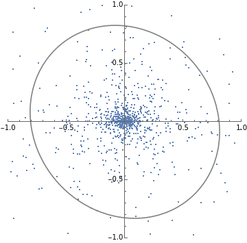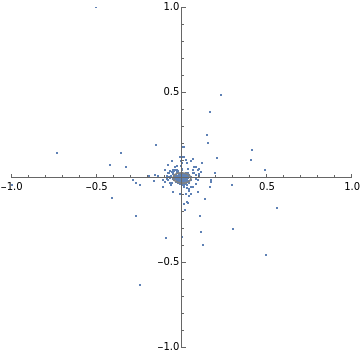 SeedRandom[1];batchStepDist[W_,α_]:=Module[{},step[x_,w_]:=Module[{},(IdentityMatrix[d]-αOuter[Times,x,x]).w];MapThread[step,{RandomVariate[dist,n],W}]];stepL2SGDfast[h_]:=Module[{d=Length[h],normalize,step,evec},normalize[v_]:=v/Sqrt@Total[v*v];step[v_]:=2h*v+h*Total[v];evec=FixedPoint[normalize[step[#]]&,ConstantArray[1.,d],1000];2/Norm[step@evec]];h={1,3};d=Length[h];n=1000;numSteps=30;dist=MultinormalDistribution[{0,0},DiagonalMatrix[h]];W=RandomVariate[MultinormalDistribution[{0,0},DiagonalMatrix[{1,1}]],n];criticalAlpha=stepL2SGDfast[h];trajectories1=NestList[batchStepDist[#,criticalAlpha]&,W,numSteps];(*numStepsxBxdims*)trajectories2=NestList[batchStepDist[#,criticalAlpha*1.3]&,W,numSteps];(*numStepsxBxdims*)Print[stepL2SGDfast[h]]plots1=ListPlot[#,PlotRange{{-1,1},{-1,1}},AspectRatio1]&/@trajectories1[[;;;;10]];plots2=ListPlot[#,PlotRange{{-1,1},{-1,1}},AspectRatio1]&/@trajectories2[[;;;;10]];TableForm[{plots1,plots2}];(*Givencovariancematrix,plotcontourlinesthatalignedwithdata*)visualizeCov[cov_]:=Module{x,y},ContourPlot