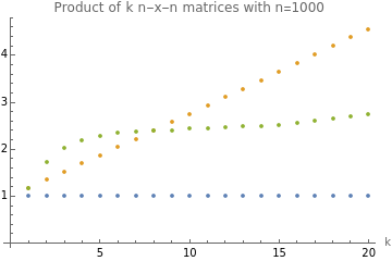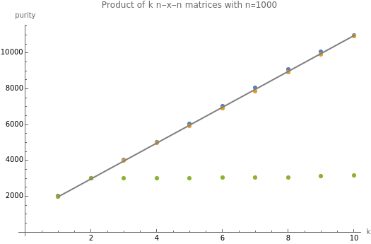 normal=NormalDistribution[];uniform=UniformDistribution[{-1,1}];dist=normal;matsNormal=NestList[#.sample&,sample,maxK-1];dist=uniform;matsUniform=NestList[#.sample&,sample,maxK-1];(*Productofkrandommatrices*)randomProduct[k_]:=Nest[#.sample&,sample,k-1];center[mat_]:=(mat-Mean[Flatten@mat]);relu[mat_]:=Clip[mat,{0,∞}];matsRelu=NestList[center@Abs@#.sample&,sample,maxK-1];observedPlot=ListPlot[(npurity2/@#)&/@{matsNormal,matsUniform,matsRelu},PlotLegends->{"Normal entries","Uniform entries","Normal+clip+center"}];predictedPlot=Plot[n(k+1),{k,1,maxK},PlotLegends->{"n(k+1)"},PlotStyle->Gray];SF=StringForm;Show[observedPlot,predictedPlot,AxesLabel->{"k","purity"},PlotLabel->SF["Product of k n-x-n matrices with n=``",n]]