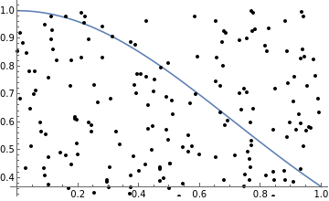 Clearly, the probability of any such a point being enclosed between the function and the y axis is equal to the ratio of the area enclosed by the function to the total area of the rectangle. Thus, the ratio of the number of points enclosed by the function to the total number of points, when multiplied by the area of the rectangle (which, in this case, is 1), gives an approximation to the value of the definite integral.