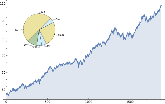 backtestShort[startDate_,window_,period_]:=Block[{data,endDate,ret,weights,meanRet,portfolioMean,covMat,portfolioVar,mv,alloc,futureData,port},(Clear[data,endDate,ret,weights,meanRet,portfolioMean,covMat,portfolioVar,mv,alloc,futureData,port];endDate=DayPlus[startDate,window*period,"BusinessDay"];data=FinancialData[#,"Close",{startDate,endDate}]&/@portfolio;ret=FinancialData[#,"FractionalChange",{startDate,endDate},"Value"]&/@portfolio;weights=Transpose[{Subscript[w,#]&/@portfolio}];meanRet={Mean[#]&/@ret};portfolioMean=Flatten[meanRet.weights][[1]];covMat=Covariance[Transpose[ret]];portfolioVar=Flatten[Transpose[weights].covMat.weights][[1]];mv=NMinimize[{portfolioVar,Union[GreaterEqualThan[0.05][#]&/@Flatten[Transpose[weights]],LessEqualThan[0.25][#]&/@Flatten[Transpose[weights]],List[Total[weights][[1]]1],List[GreaterEqualThan[0.0][portfolioMean]]]},Flatten[weights]];;alloc=Last[mv[[2]][[#]]]&/@Range[Length[portfolio]];futureData=FinancialData[#,"Close",{endDate,DayPlus[endDate,window,"BusinessDay"]}]&/@portfolio;List[mv[[2]]TimeSeriesThread[alloc.#&,futureData]])];