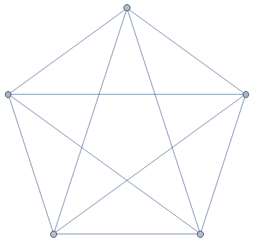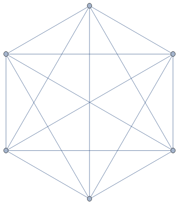 , the complete graph on 6 vertices. The vertices are labeled 1 through 6, and an edge joining vertices i and j is denoted by i j.