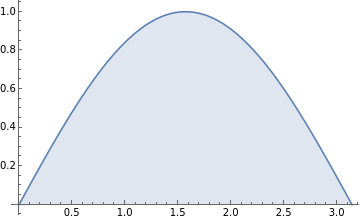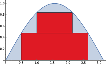 rectXCoord= {0,0.6}, {0.6,1}, {1,2}, {2,2.4}, {2.4,3};bars=Map[Graphics[ EdgeForm[{Thickness[Medium],Black}], Red, Polygon[{{#[[1]],0},{#[[2]],0},{#[[2]],Sin[#[[1]]]},{#[[1]],Sin[#[[1]]]}}]]&,rectXCoord];rectArea=Plus@@ Map[ (#[[2]]-#[[1]])*Sin[#[[1]]]&, rectXCoord];Grid[ {Show[Flatten[{functionPlot,bars,functionPlot}],ImageSizeMedium]}, {"Rectangle area "<>ToString[rectArea//N]}, {"Actual area "<>ToString[area//N]}, {"Error "<>ToString[error//N]}]