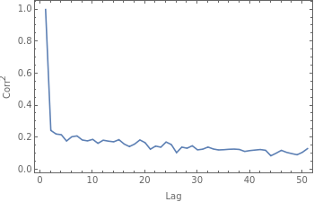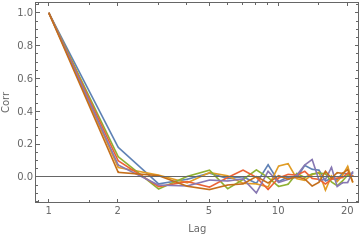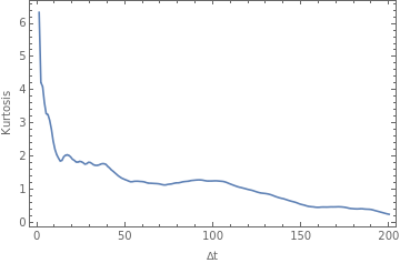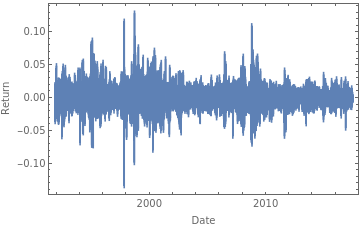 prices=FinancialData["^MXX",All];Returns[x_,Δt_]:=N[Log[Drop[x[[All,2]],Δt]]-Log[Take[x[[All,2]],{1,-(1+Δt)}]]];SmoothHistogram[Table[Returns[prices,Δt],{Δt,1,8}],PlotRangeFull,PlotLegendsTable["Δt = "<>ToString[i],{i,1,8}],FrameTrue,FrameLabel{"R","Density function"}]