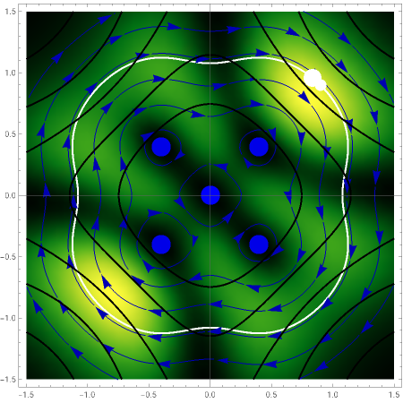 The trigonometric Pöschl–Teller potential (proposed for the first time in 1933 [1]) approximates the diatomic molecular potential energy. In the causal interpretation, superposed states, constant phase shifts, and non-factorizability are necessary for quantum motion to occur. Under certain circumstances, the motion might be chaotic (see Related Links). This Demonstration studies a two-dimensional version of the trigonometric Pöschl–Teller potential, which is in a special superposition state. If the perturbation term becomes zero (), the wave density (given by the square of the Schrödinger wavefunction) is not time dependent, but the corresponding autonomous differential equation system for the velocity field leads to a periodic motion in the configuration space. With the perturbation term, the Bohmian trajectory forms periodic, quasi-periodic, weak ergodic, or chaotic curves while interacting with the nodal points. Further investigations are necessary to capture the full dynamics of this system. The graphic shows the squared wavefunction, the trajectory (white), the nodal points (blue), the contour lines of the potential (gray), and the velocity field (red).