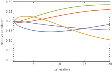This Demonstration illustrates an evolutionary tournament based on the prisoner's dilemma that proceeds as follows: In the initial generation there are five players, each playing a particular strategy. These players then conduct a tournament in which each pair of players plays a large number of rounds of the prisoner's dilemma game using their respective strategies. The second generation consists of the same set of player types and player strategies, but redistributed according to the payoffs in this tournament. For example, if player 1's payoff was twice that of player 2, the second generation will include twice as many copies of player 1 (with each playing the strategy of player 1) as of player 2. Continuing this process over many generations, we find that some strategies tend to become dominant, while others die out. This Demonstration shows the evolution of player populations over 20 generations.
