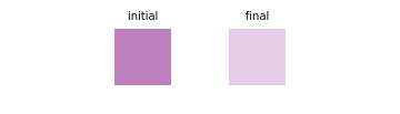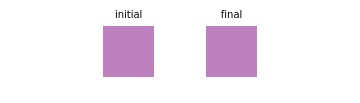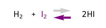 For "mechanical analogy", on the left the reaction is mostly forward and on the right it is mostly backward; these are fixed and are useful to represent the extreme cases when one reaction is predominant. In the middle, the opacity of the arrows is proportional to the forward and backward reaction rate and changes every time the initial concentration is modified. Iodine in its gas phase is colored purple, while the other components are colorless. Thus the reaction rate can be monitored by the intensity of the color.