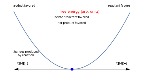 A simple mechanical analogy of a ball in a concave surface helps to explain how the reaction is shifted: when it is on the left, it tends to roll to the right, like the reaction is shifted to the right (the value is assumed positive because reactant concentrations decrease, while product concentrations increase). The opposite happens on the other side. At the bottom, the equilibrium has already been reached, so there is no change in the concentrations. This shifting can be obtained by changing the initial concentration of .