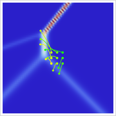 This Demonstration shows a particle-based fluid trajectory description of multi-soliton interactions. The Kadomtsev-Petviashvili (KP) equation is the two-dimensional version (2+1 dimensions, including time) of the Korteweg–de Vries (KdV) equation and supports multi-soliton-solutions. These solutions produce a pattern of straight lines in the plane at time . In particular, the KP equation describes approximately the slow evolution of waves in shallow water of uniform depth. Solitons are stable waves in space and time, in which the velocity depends on the amplitude. When solitons interact with other solitons, their shapes do not change, but their phase shifts. The trajectory method for quantum motion, developed by Louis de Broglie and David Bohm, is applied to the KP equation. In this method the motion of idealized particles is governed by the current flow, which is derived directly from the continuity equation; is proportional to the density of the wave in which idealized particles are positioned at the point at time . The current flow divided by the density establishes the guiding equation (velocity field) for the individual path of the particles in the wave. With , it yields the starting points of possible trajectories inside the wave, which lead to single trajectories governed by the velocity of the wave. Only the dynamic of the wave influences the motion of the particles. The trajectories are the streamlines of the wave, regarded as paths of idealized particles, because the particles themselves do not interact and do not influence the wave. Here the trajectories show the particle transfer of the wave in the fluid medium. The graphic shows the wave density, the trajectories, and the initial and actual position of idealized particles in the wave.