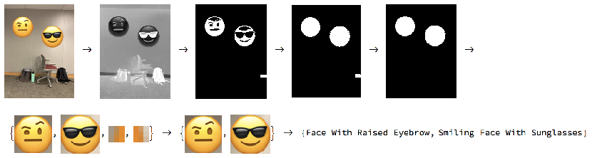 Locating the emojis is accomplished via SelectComponents and a masking workflow using ColorDistance and Filling Transform. I made a few example images to test my functions.