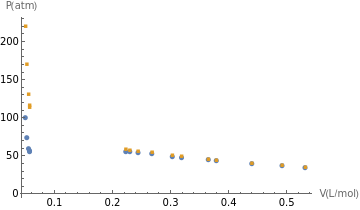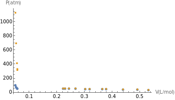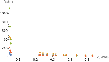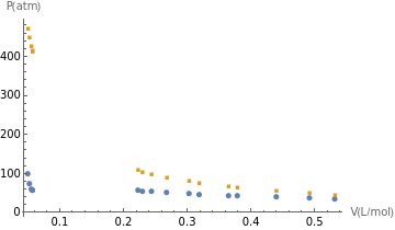 t293=Quantity[293,"Kelvins"];p293=QuantityArray[{35.,37,40,44,45,48,50,53,55,56,56.5,56.5,57,60,75,100},"Atmospheres"];v293=QuantityArray{0.533,0.493,0.441,0.380,0.366,0.320,0.304,0.269,0.245,0.231,0.224,0.0583,0.0580,0.0566,0.0536,0.0511},;