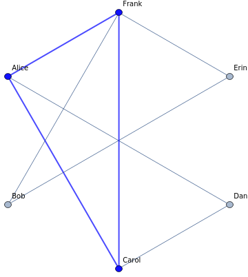 HighlightGraph[CompleteGraph[6,VertexLabels{1Alice,2Bob,3Carol,4Dan,5Erin,6Frank}],{12,15,23,24,35,45,46}]
