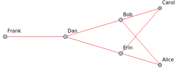 Graph[{12,15,23,24,35,45,46},VertexLabels{1Alice,2Bob,3Carol,4Dan,5Erin,6Frank},EdgeStyleRed]