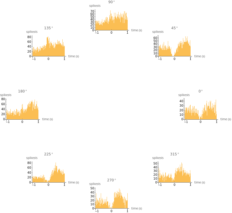 psths=MapIndexed[Show[BarChart[#1,PlotLabelToString[Extract[directions,#2]]°],AxesTrue,Ticks{{{5,-1},{50,0},{100,1}},Automatic},AxesLabel{"time (s)","spikes/s"}]&,firingRate];
