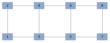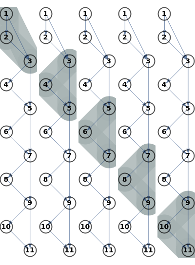 g=GridGraph[{2,4},GraphStyle"DiagramBlue"];gtarget={{{1,2,3},{2,3,4},{3,4,5},{4,5,6},{5,6,7},{6,7,8}},{{{1,2,3},{2,3,4}},{{2,3,4},{3,4,5}},{{3,4,5},{4,5,6}},{{4,5,6},{5,6,7}},{{5,6,7},{6,7,8}}}};initAndRunDecomposition[g];(*Todo:renamebagstojbags*)jbagsFirst[target];jedges=Last[target];checkTreeDecomposition[jbags,jedges];getCost[n_]:=(g=GridGraph[{2,n},GraphStyle"DiagramBlue"];initAndRunDecomposition[g];getTreeCost[{jbags,jedges}])ListPlot[getCost/@Range[10]]g=GridGraph[{2,4}];initAndRunDecomposition[g];drawBagOnGraph/@jbags(*testdirecteddecomposition*)resnet=Graph[{12,13,23,34,35,45,56,57,67,78,79,89,910,911,1011}];initAndRunDecomposition[resnet,True];GraphicsGrid[{drawBagOnGraph/@jbags},ImageSize400]