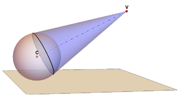 I is a perceived image point inside the view disk perpendicular to VC. According to the law of reflection, the lines VQI and SRQ will form equal angles with the normal n to the sphere in Q. All image points will be restricted to a disk that is the base of the view cone with the line CV as axis and an opening angle of tan^-1(zv/xv). This image disk is at an offset 1/xv from C and has a radius of Sqrt[1-(1/xv)^2].