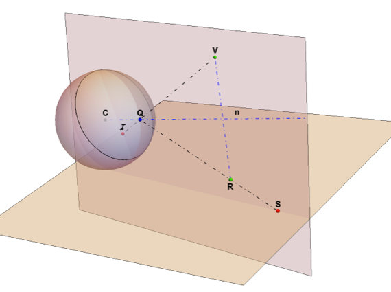 The points C, Q, I, V and S are all in the same plane. We have R, the projection of V to the normal n.