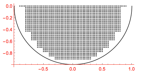pts=Table[Table[{x,y},{x,-Floor[Sqrt[1-y^2],.1]+.1,Floor[Sqrt[1-y^2],.1]-.1,.025}],{y,0,-.9,-.025}];viewDisk=Graphics[{Circle[{0,0},1,{π,2.π}],{AbsolutePointSize[2],Point/@pts}},AxesTrue,AxesOrigin{-1,-1},AxesStyleDirective[Thin,Red]]