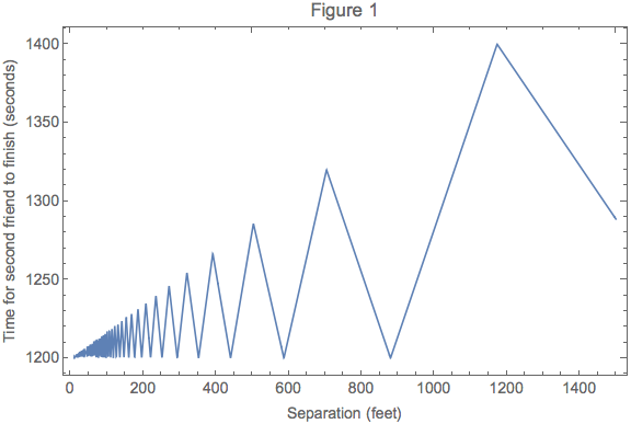 d=5280.;wA=wB=2*5280/3600;rA=rB=6*5280/3600;Plot[tFinal[wA,rA,wB,rB,d,h],{h,10,1500},FrameTrue,FrameLabel{"Separation (feet)","Time for second friend to finish (seconds)"},LabelStyleDirective[Larger],GridLinesNone,ImageSizeLarge,PlotLabel"Figure 1"]