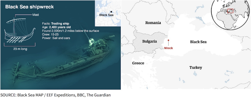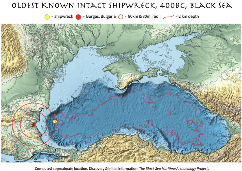 Deep-sea treasure hunt... with a research team... discovering a time capsule from 400BC... it hardly gets better than this. Past week the media was abuzz about an extraordinary discovery made by the team of Black Sea Maritime Archaeology Project (Black Sea MAP). They found the oldest known intact shipwreck estimating its age as 2,400 years via radiocarbon dating. Remarkable preservation of the ship is due to unique feature of the Black Sea lacking oxygen below ~150 meters, so there are almost no life and no chemical or biological corrosion of the ships’ materials. Good summaries can be found at ArsTechnica, BBC, NPR, The Guardian, and many other sources. So far we know from the media: