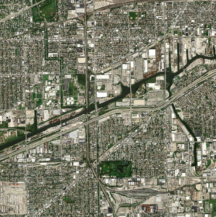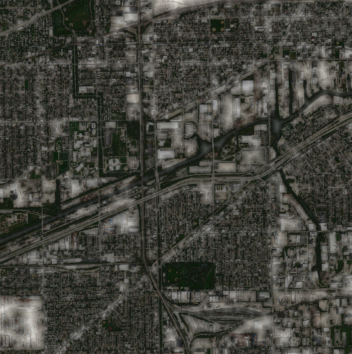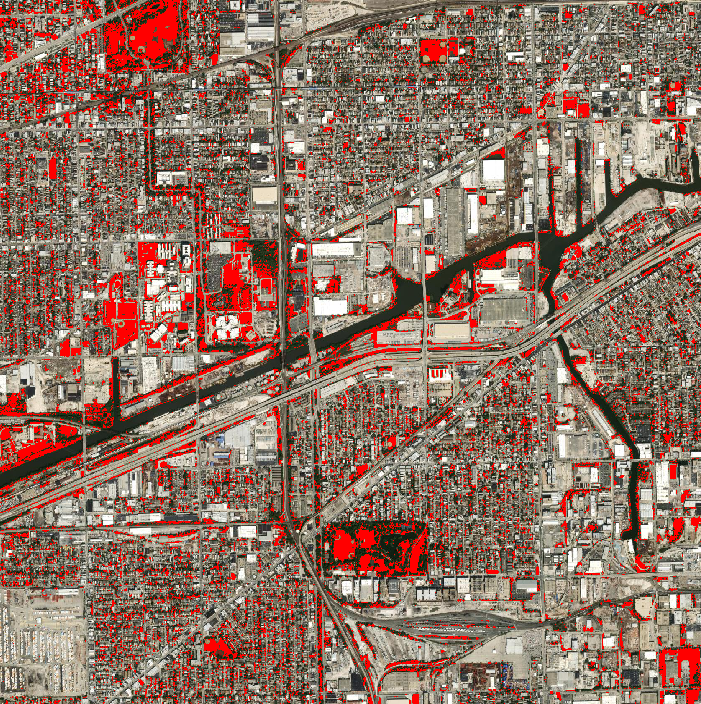 We also discovered the function DistanceTransform which can visualize distance to the background using value. By highlighting the green spaces with white and making everything else black, the function could be used. This image was then made semi-transparent and overlaid on the satellite image.