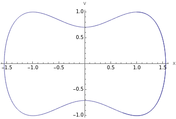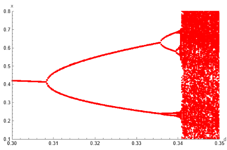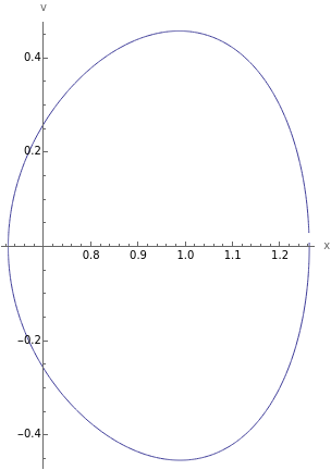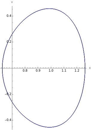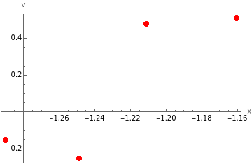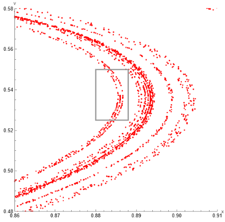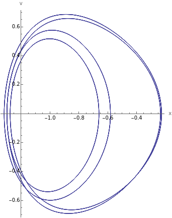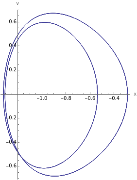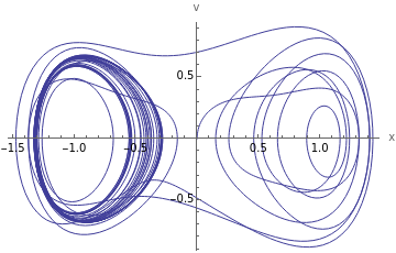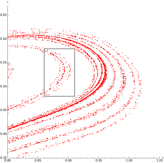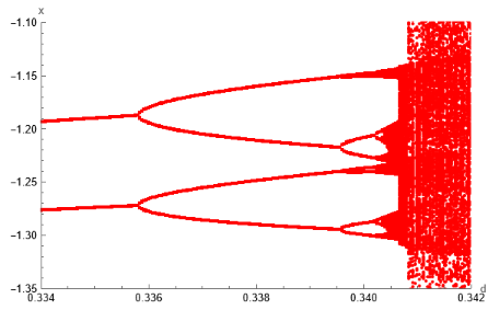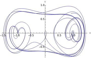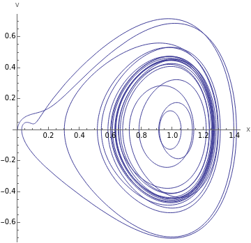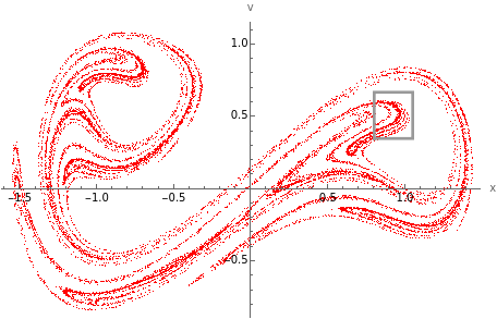poincare2[d_,γ_,ω_,ndrop_,nplot_,psize_,xmin_,xmax_,vmin_,vmax_]:=T=2πω;g[{xold_,vold_}]:={x[T],v[T]}/. NDSolvev'[t]==x[t]-x[t]^3-γv[t]+dCos[ωt], x'[t]==v[t],x[0]==xold,v[0]==vold, {x,v},{t,0,T}[[1]];lp2=ListPlotDrop[NestList[g,{0,0},nplot+ndrop],ndrop],PlotRange{{xmin,xmax},{vmin,vmax}},PlotStyle{PointSize[psize],Hue[0]},PlotRange->All, AxesLabel->{"x","v"},AxesOrigin{xmin,vmin},AspectRatio1