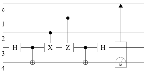 superdensecoding=QuantumCircuitOperator[{QuantumOperator["H",{3}],QuantumOperator["CNOT",{3,4}],QuantumOperator["CX",{2,3}],QuantumOperator["CZ",{1,3}],QuantumOperator["CNOT",{3,4}],QuantumOperator["H",{3}],QuantumMeasurementOperator[{3,4}]}];superdensecoding["Diagram"]