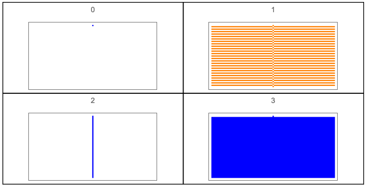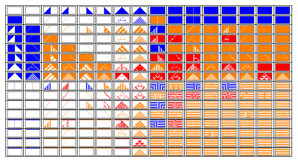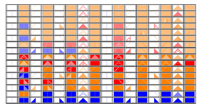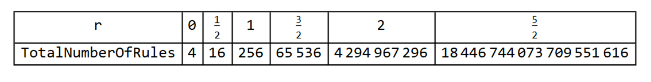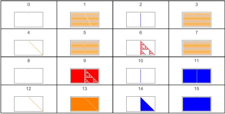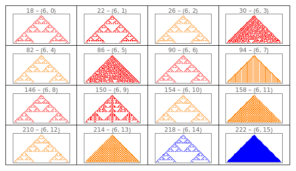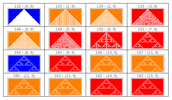 Manipulate[GraphicsGrid[{Tooltip[ArrayPlot[CellularAutomaton[{#,2,r},init,{50,{-50,50}}],ColorRules{0White,1colors[[ComputeWolframClass[#,r,random]]],_Black}],{#,RuleGenes[#,r,2]}]&/@(FromGenes[#,r]&/@Thread[List[GeneSet[r],OffsetGeneSet[r,2,1]]]),Tooltip[ArrayPlot[CellularAutomaton[{#,2,r},1-init,{50,{-50,50}}],ColorRules{0White,1colors[[ComputeWolframClass[#,r,random]]],_Black}],{#,RuleGenes[#,r,2]}]&/@(FromGenes[#,r]&/@Thread[List[GeneSet[r],OffsetGeneSet[r,2,1]]])}],{r,{0,1/2,1,3/2}},{init,{{{1},0}"Simple",random"Random"}},FrameLabel"Rule Space Diagonal",SaveDefinitionsTrue]