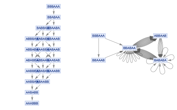 Display the StatesGraph of the String Rewrite System with three “growth rules” and three “decay rules” with initial condition “A” after 6 evolution steps