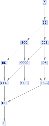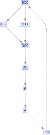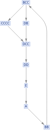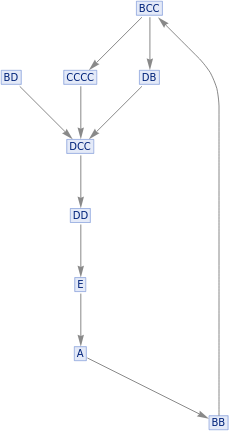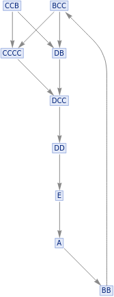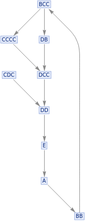 As for growth-decay rules, the figure below demonstrates how features of the form “CDC” are now part of the directed cycle. This remains true, independent of where the initial condition is in the cycle. Note that this was not the case with SRS, the figure above with the initial condition “CDC” selected shows that no graph is generated. In the circular string system “CDC” is an equivalent state to “DCC”, and the rule “CC””D” can be applied.