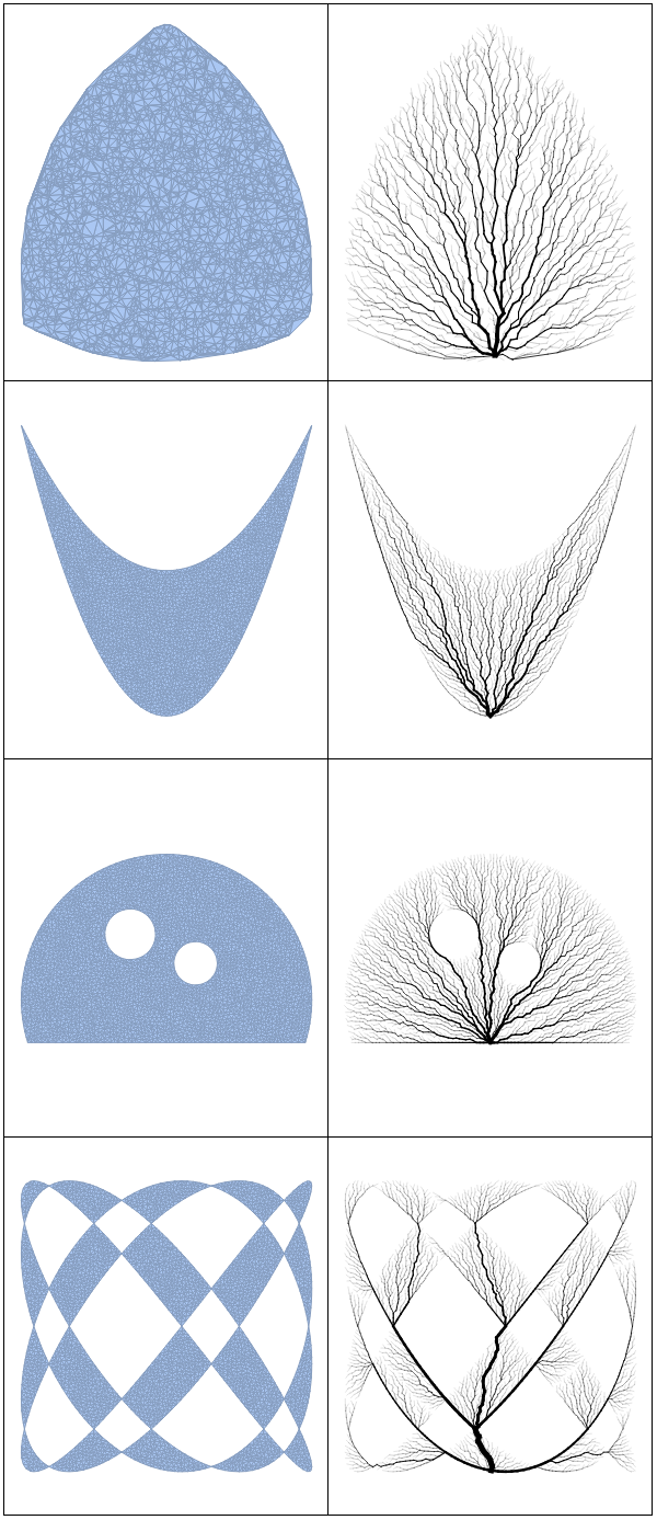 (*exampleregions:*)reg1=BooleanRegion[And,{Disk[{0,.5},1],Disk[{-.5,-.2},1],Disk[{.5,-.2},1]}];mr1=DelaunayMesh[RandomPoint[reg1,3000]];reg2=ParametricRegion[{{s,(1+t)s^2-t},-1≤s≤1&&0≤t≤1},{s,t}];mr2=DiscretizeRegion[reg2,MaxCellMeasure{"Length".05}];reg3=BooleanRegion[Xor,{DiskSegment[{0,0},2,{-.3,Pi+.3}],BooleanRegion[Or,{Disk[{-.5,.9},.35],Disk[{.4,.5},.3]}]}];mr3=DiscretizeRegion[reg3,MaxCellMeasure{"Length".1}];(*regiontakenfromDocumentation/ParametricRegion/Scope:*)constraint=-3/4+(5*x-20*x^3+16*x^5)^2-(5*x-20*x^3+16*x^5)*(1-8*y^2+8*y^4)+(1-8*y^2+8*y^4)^2≤0;mr4=DiscretizeRegion[ImplicitRegion[constraint,{x,y}],MaxCellMeasure{"Length".05}];regions={mr1,mr2,mr3,mr4};