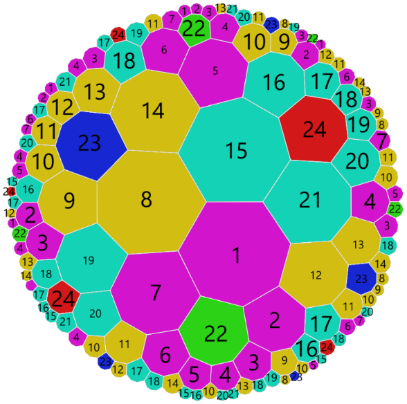 Messing around with hyperbolic tiling, I managed to make a new map for the hyperbolic version of the Klein quartic graph. Previous embeddings usually made it difficult to see what was happening with two of the vertices.
