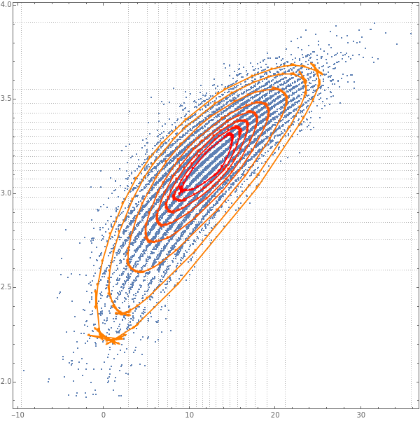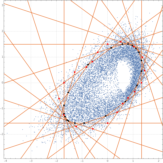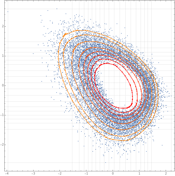 Block[{data=sndData},Show[{ListPlot[data,AspectRatio1,PlotTheme{"Detailed"},GridLinesMap[Quantile[#,Range[0,1,1/(20-1)]]&,Transpose[data]],PlotLegendsSwatchLegend[Blend[{Red,Orange},Rescale[#1,{Min[qs],Max[qs]},{0,1}]]&/@qs,qs]],Graphics[{PointSize[0.005],Thickness[0.0025],MapThread[{Blend[{Red,Orange},Rescale[#1,{Min[qs],Max[qs]},{0,1}]],Tooltip[Line[Append[#2,#2〚1〛]],#1],Point[#2]}&,{qs,qsPoints}]}]},ImageSize600]]