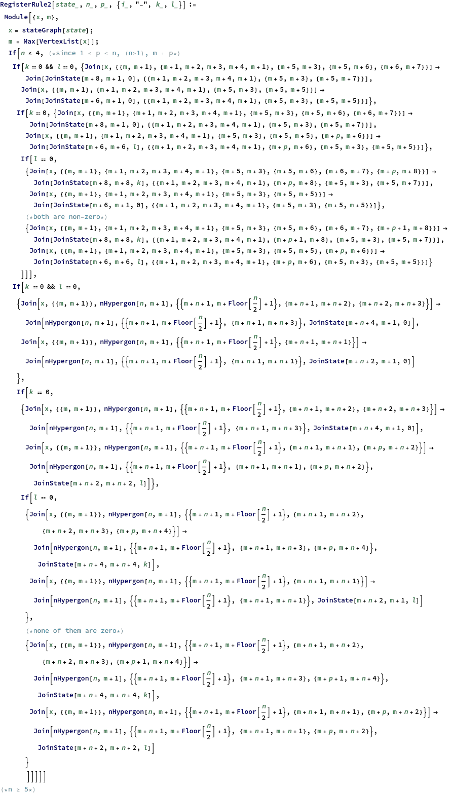 RegisterToAssocHelper[stateReg_,instructions_,acc_,num_]:=Module[{instr,list},instr=instructions[[1]];(*Print[acc];*)list=Lookup[acc,instr[[1]]];If[instructions=={},acc,If[instr[[2]]=="+",If[instr[[3]]==0,RegisterToAssocHelper[stateReg,Drop[instructions,1],Append[acc,instr[[1]]->Join[list,{{num,{0,0}}}]],num+1],RegisterToAssocHelper[stateReg,Drop[instructions,1],Append[acc,instr[[1]]->Join[list,{{num,{instr[[3]],Lookup[stateReg,instr[[3]]]}}}]],num+1]],If[instr[[3]]==0&&instr[[4]]==0,RegisterToAssocHelper[stateReg,Drop[instructions,1],Append[acc,instr[[1]]->Join[list,{{num,{0,0},{0,0}}}]],num+1],If[instr[[3]]==0,RegisterToAssocHelper[stateReg,Drop[instructions,1],Append[acc,instr[[1]]->Join[list,{{num,{instr[[4]],Lookup[stateReg,instr[[4]]]},{0,0}}}]],num+1],If[instr[[4]]==0,RegisterToAssocHelper[stateReg,Drop[instructions,1],Append[acc,instr[[1]]->Join[list,{{num,{0,0},{instr[[3]],Lookup[stateReg,instr[[3]]]}}}]],num+1],RegisterToAssocHelper[stateReg,Drop[instructions,1],Append[acc,instr[[1]]->Join[list,{{num,{instr[[4]],Lookup[stateReg,instr[[4]]]},{instr[[3]],Lookup[stateReg,instr[[3]]]}}}]],num+1]]]]]]]