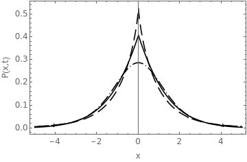 Plot[{f[0.5,2,1,1,x],f[0.25,1.75,1,1,x],f[1,1.5,1,1,x]},{x,-5,5},PlotRange->All,FrameTrue,FrameLabel{"x","P(x,t)"},FrameStyle(FontFamily"Helvetica"),LabelStyle(FontSize12),PlotStyle{Black,{Black,Dashing[{Large,Medium}]},{Black,Dashing[{0,Small,Large,Small}]}}]